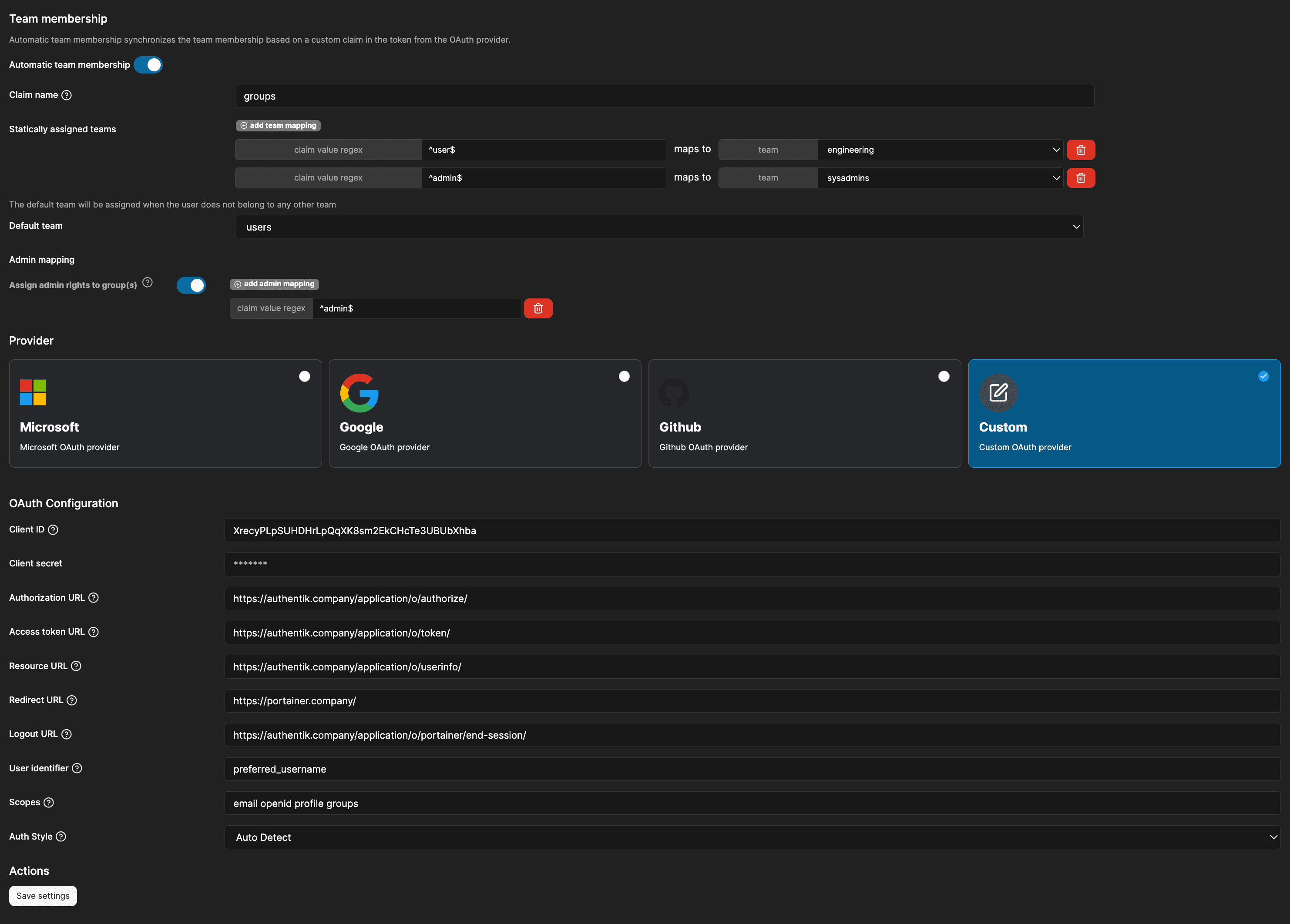 If you are using Portainer Business Edition (BE), it is possible to configure automatic team membership. This allows you to grant access to teams and environments, and automatically grant admin access to certain users based on authentik group membership. It is only possible to configure automatic group membership in Portainer BE - this cannot be configured in the Community Edition.